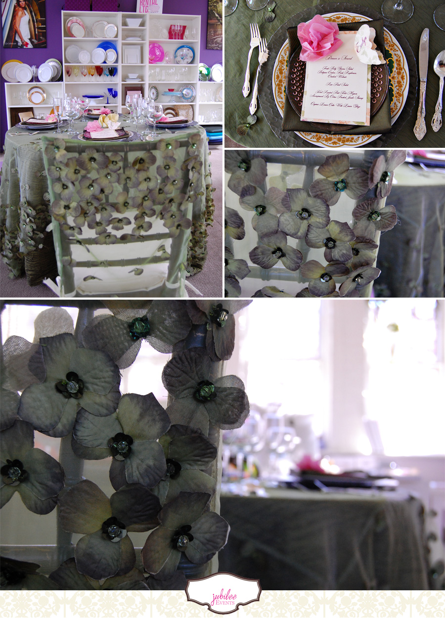 I wanted to share with you the gorgeous display in our studio featuring an amazing linen company we’ve partnered with: Resource One, Inc. Our gorgeous “Summer’s Dream” inspired tablescape features Olivewood Bark colored crinkle taffeta with an AMAZING Olive Floral Organza Overlay on the table and the chiavari chair backs. The overlays have hand stitched flowers and petals with bead detailing cascading down into large pools onto the floor. The linen is absolutely spectacular! The tablescape is finished off with luxurious Olivewood Taffeta napkins. The tablescape features beautiful and colorful china from Party Rental Ltd., a Violet Pepple Charger, Floral Dinner Plate, and Pink Dotted Dessert Plate. Gorgeous menu cards with a custom crepe paper flower and butterfly place cards are designed by our talented friends at Posh Paperie. If you’d like to learn more about renting this gorgeous ensemble for your event, give us a ring!